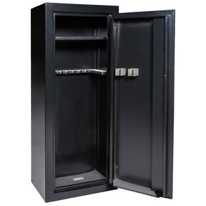 The Liberty Gun Cabinet 18 offers expanded storage capacity while maintaining the same American-made strength and precision. This stout cabinet is made of 14-gauge American steel, and it’s a great safe storage solution for keeping firearms organized and properly secured. It features an all-gun interior rack and comes equipped with two adhesive barrel holders for storing additional long guns on the door.