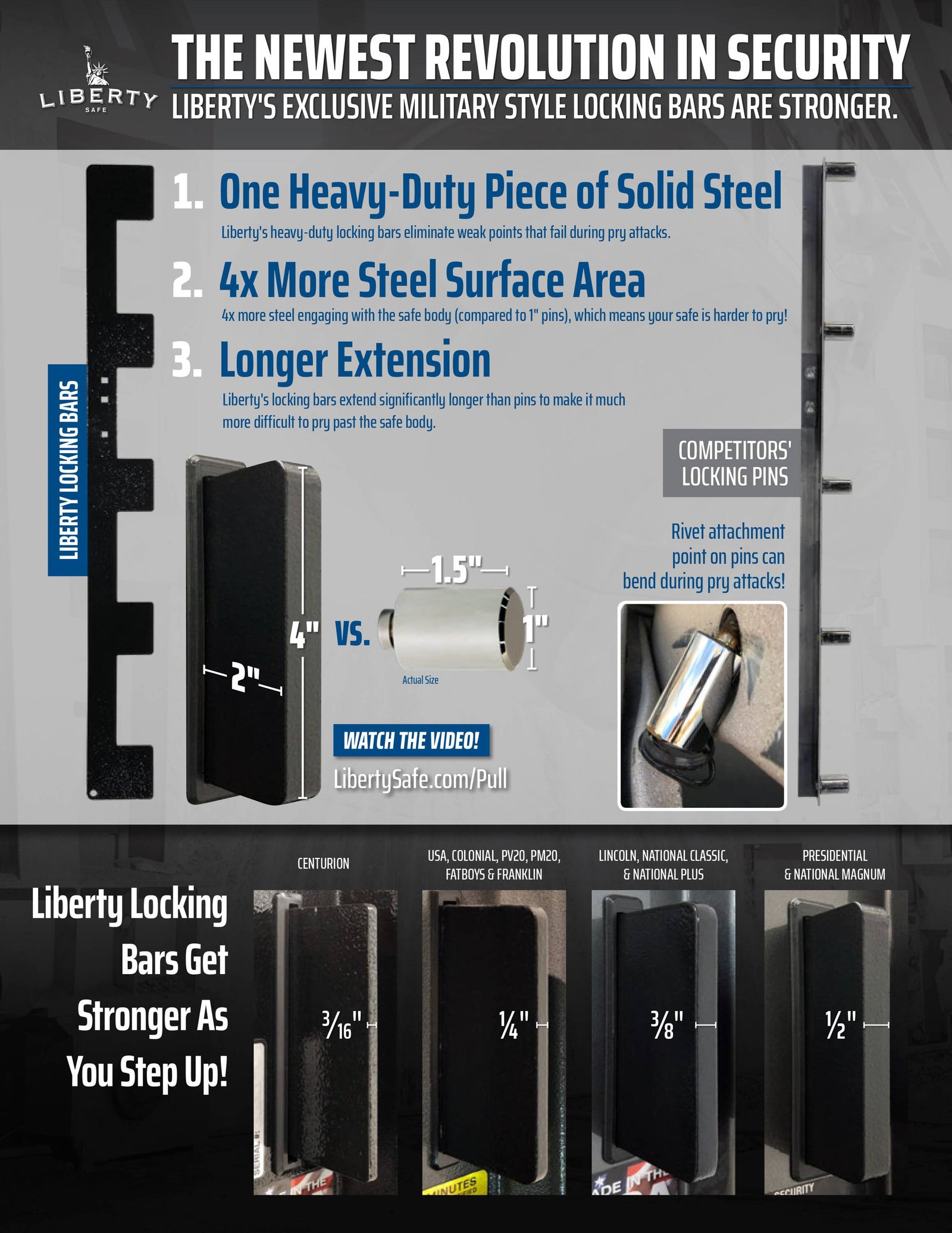 Locking bars are 4 inches wide and six times stronger than round pins found in other safes. They provide a larger surface that resists prying and punching because they go deeper into the safe when locked in place. They are also made from one, solid piece of American-made steel.